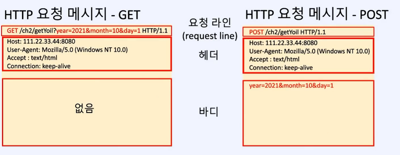 - 요청 메시지에는 크게 GET, POST 요청이 있다( 요청 메서드)