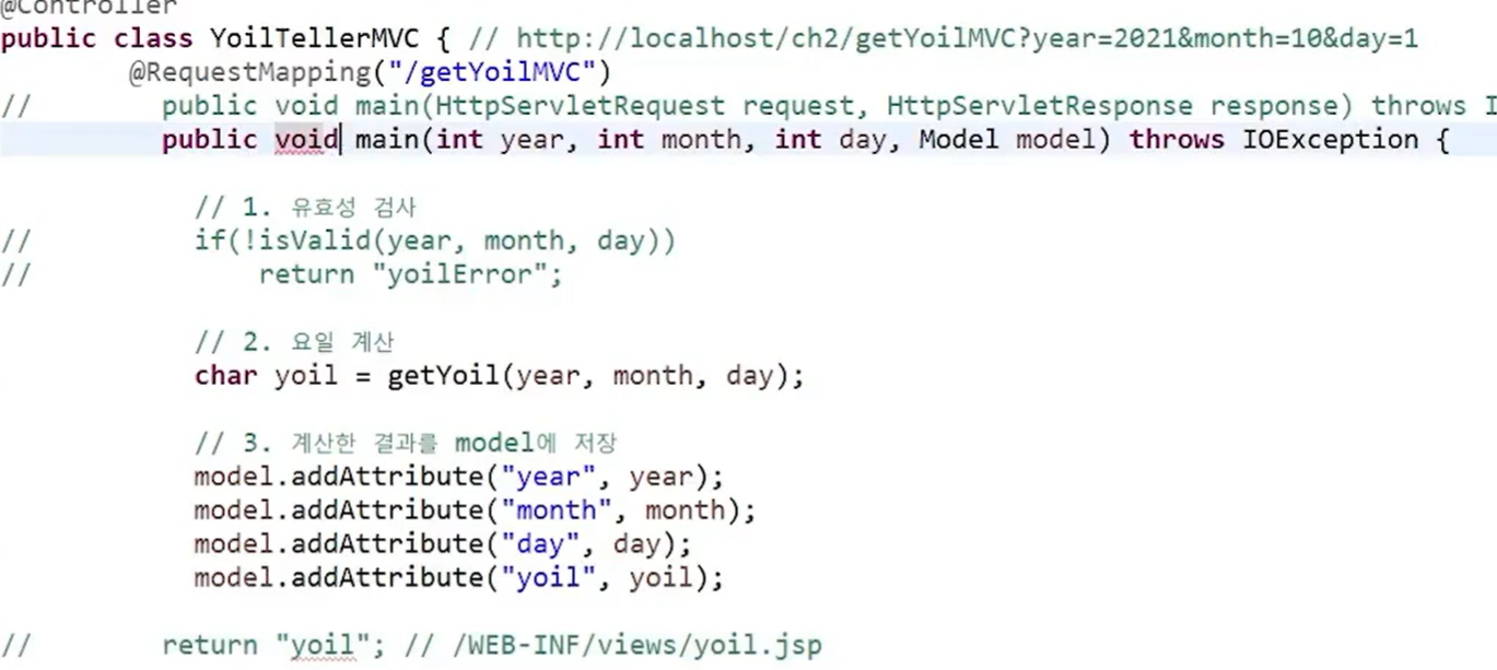 1. Dispatcher로 부터 받던 매개변수 Model을 지우고 Controller에서 ModelAndView를 생성한다.