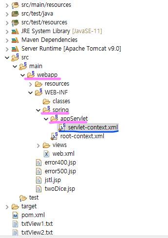 Spring프로젝트의 폴더를 살펴보면 [webapp] → [spring] → [appServlet] → servlet-context.xml파일이 위치한다.