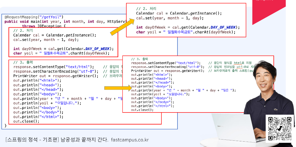 위와 같이 처리하는 부분을 Controller, 출력하는 부분을 View, 이 둘 간의 데이터를 주고받을 수 있는 객체가 Model이라고 하여 MVC 패턴이라고 한다.
