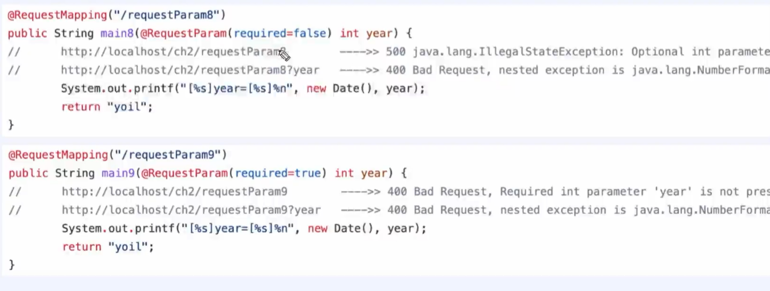 사용자가 http://localhost/ch2/reuestParam2 와 같이 year가 없이 넘어오면 year 값은 null이 된다.