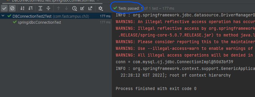 그 후 dataSource 빈을 활용하여 connection을 맺고 assertTrue()를 통해 connection이 null 이 아니면 테스트를 통과한다.