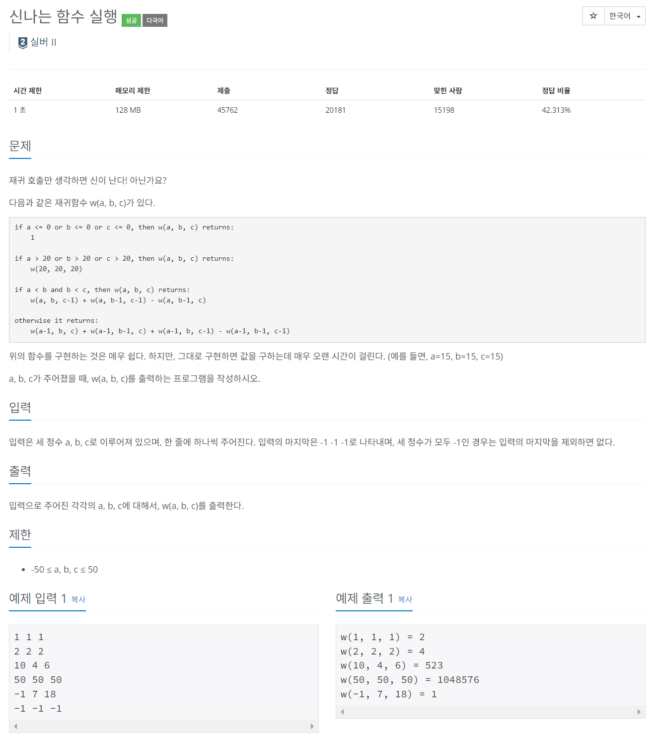 return dp[20][20][20] = w(20, 20, 20);